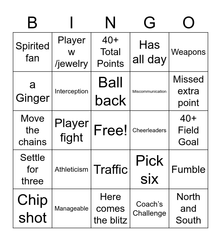 This bingo card has a free space and 24 words: Athleticism, Manageable, Ball back, Chip shot, Weapons, Spirited fan, a Ginger, Player w /jewelry, Cheerleaders, Traffic, Miscommunication, Move the chains, Pick six, Fumble, Interception, Coach’s Challenge, 40+ Field Goal, 40+ Total Points, Missed extra point, Player fight, North and South, Settle for three, Has all day and Here comes the blitz.