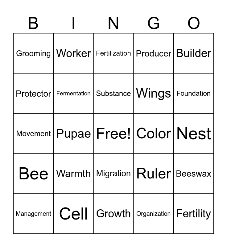 This bingo card has a free space and 100 words: Insect, Flowers, Nest, Collector, Sting, Leader, Honey, Female, Breeder, Stage, Abdomen, Nectar, Opening, Cell, Monarch, System, Wings, Eyes, Hairs, Vibration, Stage, Fur, Helper, Nectar, Ritual, Color, Builder, Ruler, Cells, Patterns, Pupae, Grooming, Guarding, Harvesting, Organization, Substance, Beeswax, Constant, Reservoir, Queen, Basket, Climate, Movement, Fluid, Foundation, Fertilization, Thorax, Provider, Sky, Growth, Cluster, Guard, Gel, Coating, Processing, Shield, Frame, Tongue, Monarch, Producer, Polygon, Covering, Expansion, Stomach, Glide, Gatherer, Cluster, Syrup, Steady, Tube, Vent, Warmth, Compartment, Caretaker, Insect, Forager, Growth, Protector, High, Nurture, Gathering, Fertility, Aroma, Migration, Hexagon, Worker, Sting, Regulation, Flowers, Bee, Queen, Reproduction, Labor, Management, Fermentation, Insulation, Pollinator, Crop, Conversion and Foraging.