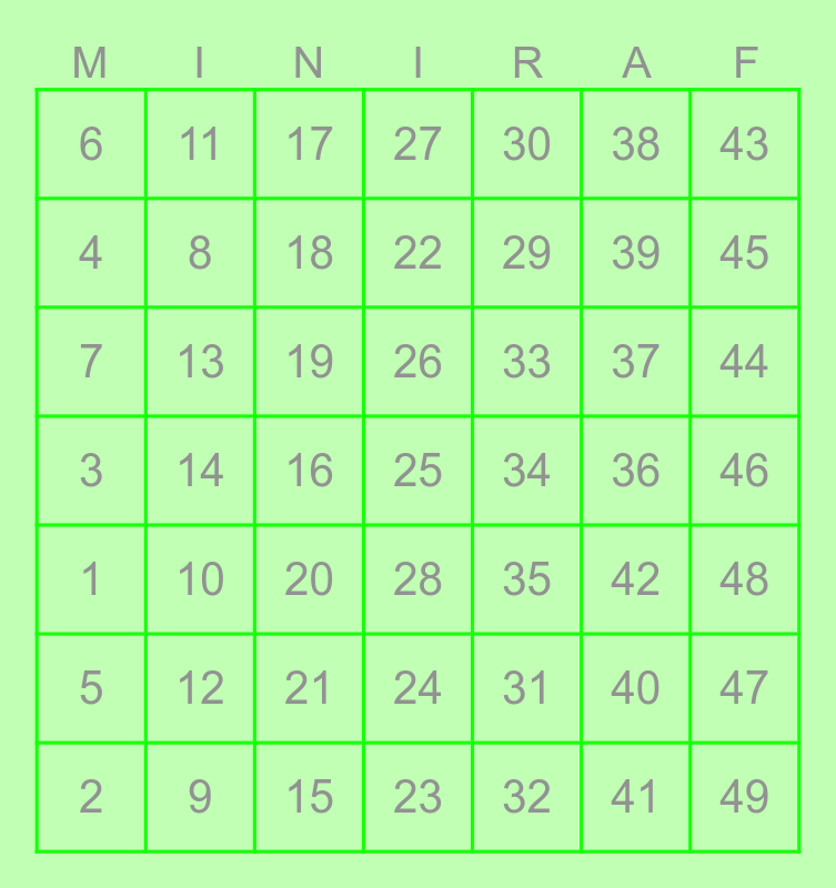 This bingo card has a free space and 48 words: 1, 14, 15, 28, 29, 36, 43, 2, 13, 16, 27, 30, 37, 44, 3, 12, 17, 26, 31, 38, 45, 4, 11, 18, 32, 39, 46, 5, 10, 19, 24, 33, 40, 47, 6, 9, 20, 23, 34, 41, 48, 7, 8, 21, 22, 35, 42 and 49.