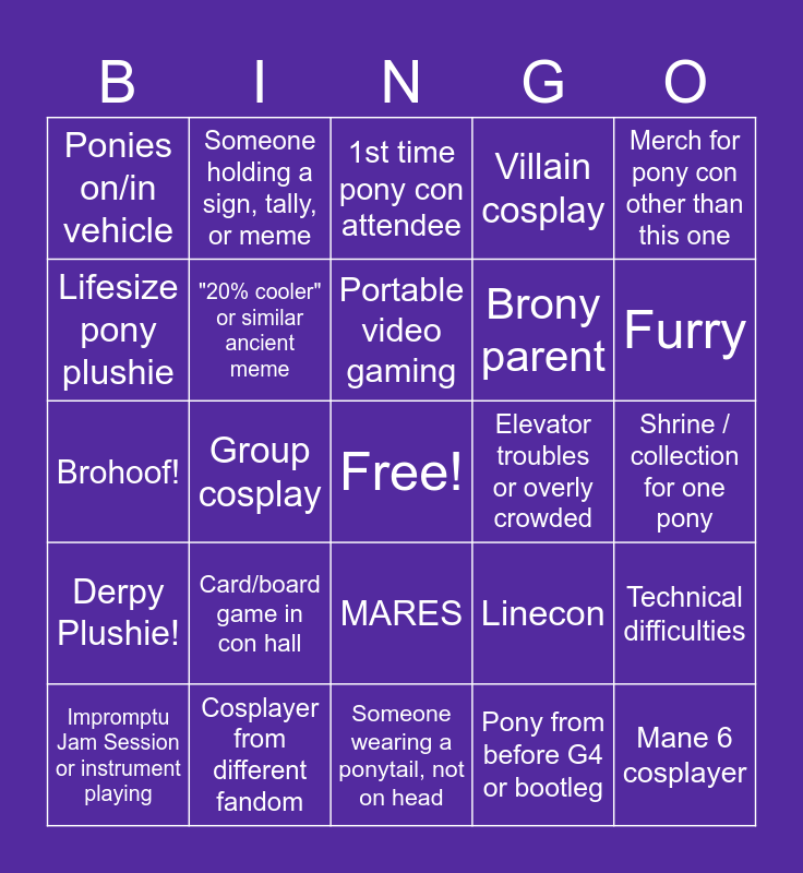 This bingo card has a free space and 49 words: Arms full of pony merch, Mane 6 cosplayer, Spontaneous singing or flash mob, Someone wearing a ponytail, not on head, Card/board game in con hall, Pony fursuit, Someone holding a sign, tally, or meme, Unironic best pony debate, Lifesize pony plushie, Unusual badge ribbons, "20% cooler" or similar ancient meme, Villain cosplay, Technical difficulties, Linecon, Normie who looks lost or out of place, Freebies / free table, Portable video gaming, Elevator troubles or overly crowded, Police, EMS, or fire dept, Merch for pony con other than this one, Group cosplay, Pony from before G4 or bootleg, Ponies on/in vehicle, Brony parent, Dakimakura, Furry, Impromptu Jam Session or instrument playing, VIP or well known person roaming con, MARES, Derpy Plushie!, Meet / see a brony from another country, Fallout Equestria, Photo with someone you like, Temporary or real pony tattoo, Cosplayer from different fandom, Unironic OC discussion, Dancing in public, Business attire, normie or otherwise, Shrine / collection for one pony, LED, glowstick, or other bright accessory, Event runs out of or over time, Obvious fan of a single pony, Shoutout to A/V!, Vloggers vlogging, Brohoof!, 1st time pony con attendee, Found another bingo square more than once, Fanfic reference other than FOE and Empty, broken, or absent ATM.
