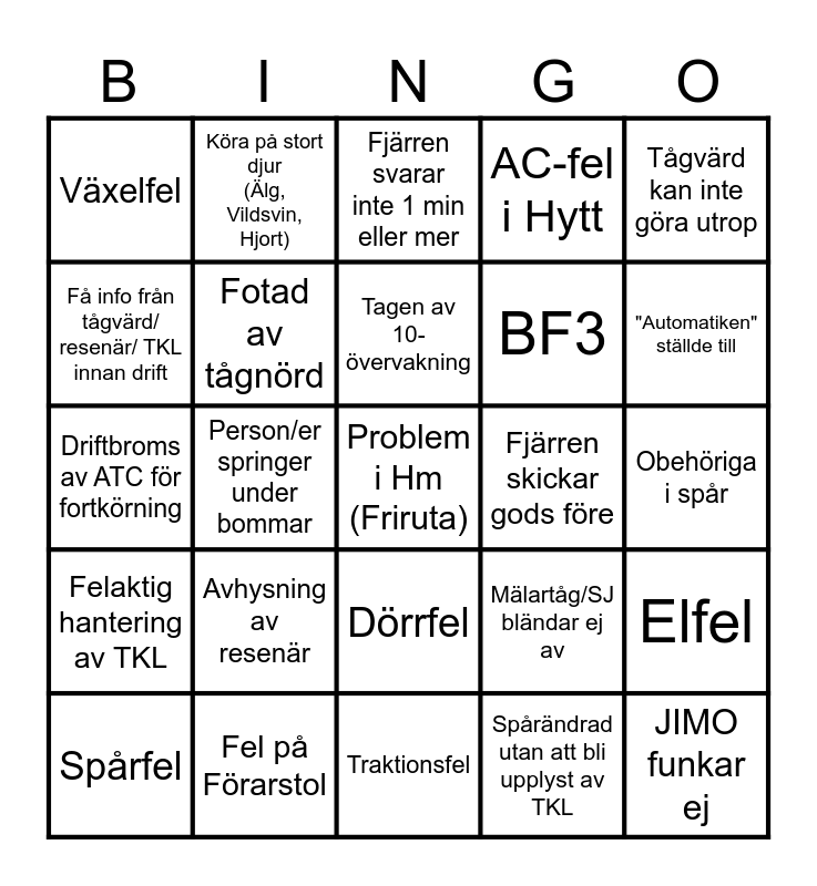 This bingo card has a free space and 24 words: Avhysning av resenär, Fel på Förarstol, Tagen av 10-övervakning, Spårfel, Tågvärd kan inte göra utrop, Växelfel, Få info från tågvärd/ resenär/ TKL innan drift, Köra på stort djur (Älg, Vildsvin, Hjort), Fjärren skickar gods före, Dörrfel, BF3, Driftbroms av ATC för fortkörning, Mälartåg/SJ bländar ej av, Elfel, Fotad av tågnörd, Spårändrad utan att bli upplyst av TKL, Obehöriga i spår, Fjärren svarar inte 1 min eller mer, "Automatiken" ställde till, Person/er springer under bommar, JIMO funkar ej, Felaktig hantering av TKL, AC-fel i Hytt and Traktionsfel.