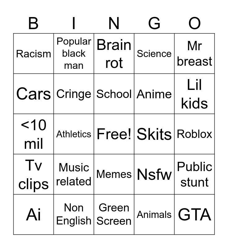 This bingo card has 1 images, a free space and 29 words: Ai, Edit, Athletics, Podcast, Racism, Brain rot, Cringe, Music related, Skits, Non English, Roblox, GTA, Green Screen, Animals, Lil kids, <100 Likes, Memes, Tv clips, Mr breast, <10 mil, Nsfw, Narrator, Anime, Cars, Science, Popular black man, Public stunt, School and Snap Word box.