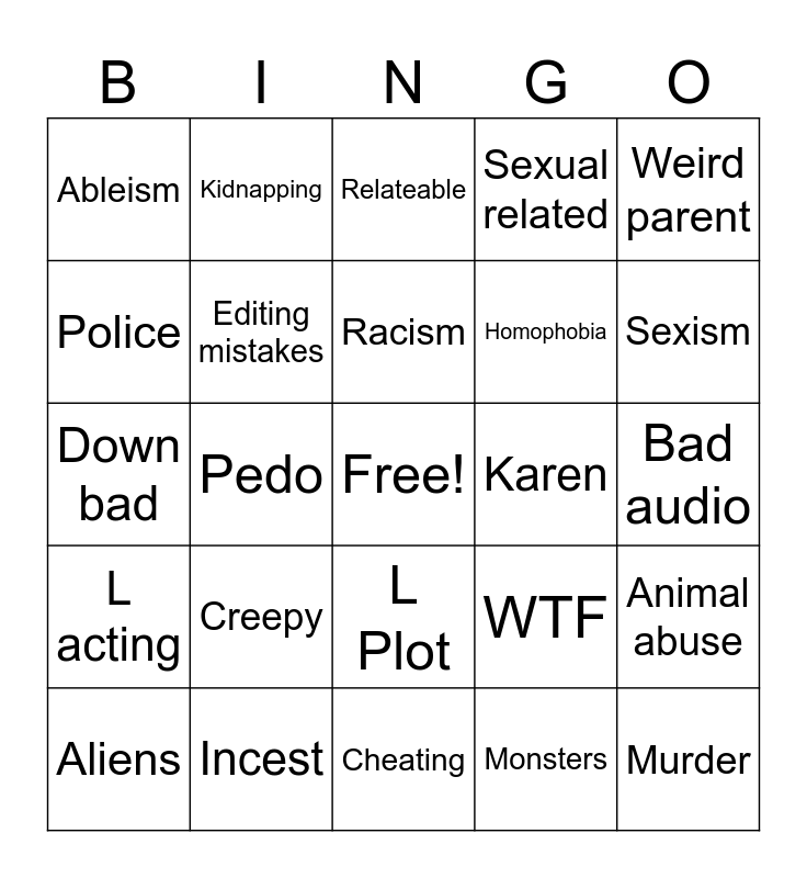 This bingo card has a free space and 24 words: Creepy, Incest, Racism, Aliens, Weird parent, Ableism, Police, Kidnapping, Karen, L Plot, Homophobia, Down bad, WTF, Animal abuse, Editing mistakes, Monsters, Bad audio, Relateable, Sexism, Pedo, Murder, L acting, Sexual related and Cheating.