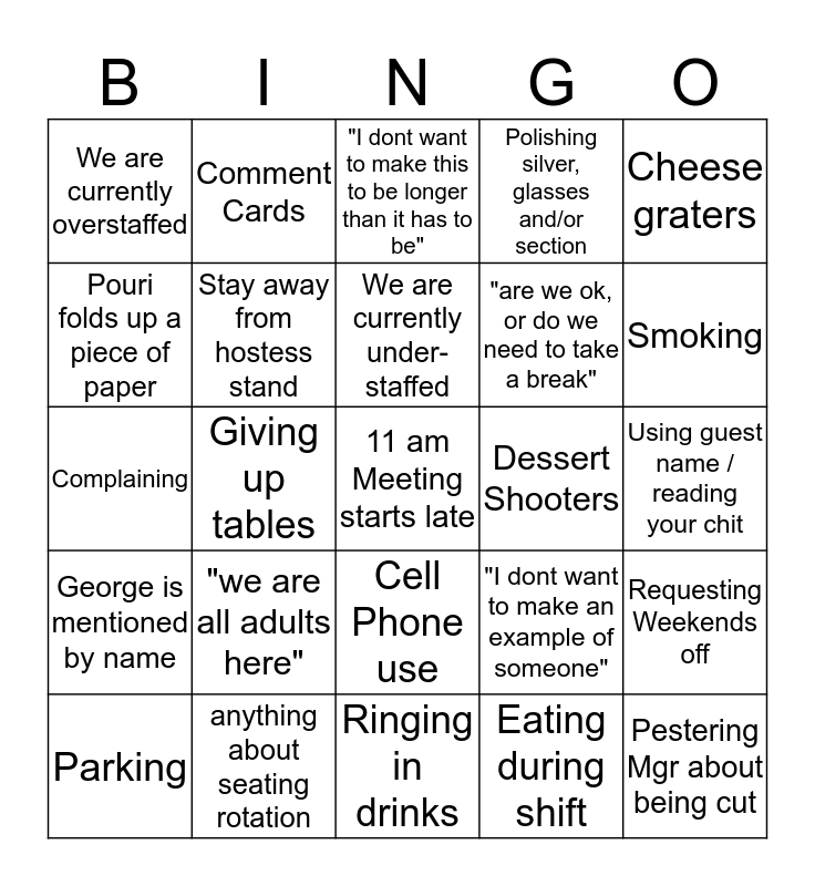 This bingo card has a free space and 24 words: "we are all adults here", anything about seating rotation, We are currently under-staffed, Parking, Cheese graters, We are currently overstaffed, Pouri folds up a piece of paper, Comment Cards, Dessert Shooters, Cell Phone use, "are we ok, or do we need to take a break", Complaining, "I dont want to make an example of someone", Requesting Weekends off, Stay away from hostess stand, Eating during shift, Using guest name / reading your chit, "I dont want to make this to be longer than it has to be", Smoking, Giving up tables, Pestering Mgr about being cut, George is mentioned by name, Polishing silver, glasses and/or section and Ringing in drinks.