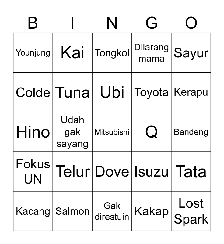This bingo card has a free space and 24 words: Telur, Salmon, Ubi, Kacang, Sayur, Younjung, Colde, Kai, Q, Dove, Toyota, Hino, Isuzu, Tata, Tuna, Kakap, Bandeng, Tongkol, Kerapu, Udah gak sayang, Lost Spark, Fokus UN, Dilarang mama and Gak direstuin.
