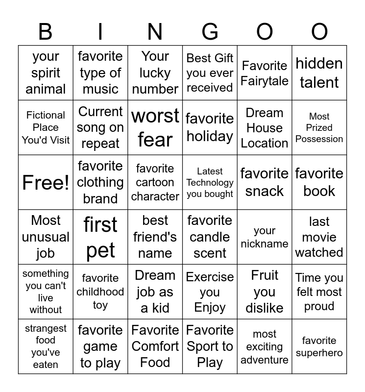 This bingo card has 36 words: Exercise you Enjoy, Dream job as a kid, Favorite Sport to Play, Fictional Place You'd Visit, Most unusual job, Latest Technology you bought, Current song on repeat, Favorite Comfort Food, Favorite Fairytale, Fruit you dislike, Most Prized Possession, Best Gift you ever received, Time you felt most proud, favorite clothing brand, favorite holiday, your spirit animal, something you can't live without, favorite snack, Free!, Your lucky number, favorite cartoon character, first pet, favorite candle scent, best friend's name, your nickname, favorite type of music, Dream House Location, favorite game to play, worst fear, hidden talent, favorite superhero, strangest food you've eaten, last movie watched, favorite book, favorite childhood toy and most exciting adventure.