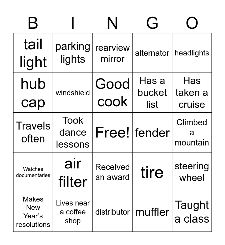 This bingo card has a free space and 71 words: roof, parking lights, ignition, clutch, steering wheel, door handle, windshield, trunk, fender, radiator grill, hub cap, windshield wiper, tire, headlights, bumper, air filter, distributor, alternator, disk brake, tail light, spare wheel, rearview mirror, muffler, hood, Same birth month as you, Traveled in the last year, Owns a moped, Never learned to ride a bike, Collects something, Recently handmade a gift, Received an award, Has performed in public, Currently is a student, Listens to podcasts, Travels often, Named after a relative, Has broken a bone, Has a nickname, Has a bucket list, Makes New Year’s resolutions, Good cook, Taught a class, Had a secret admirer, Helped a stranger, Got help from a stranger, Worked at a family business, Had a long-distance relationship, Took dance lessons, Speaks 4+ languages, Can code, Can bake a cake from scratch, Knows the whole periodic table, Can do basic car repairs, Was in a wedding party this year, Owns cryptocurrency, Invests in the stock market, Climbed a mountain, Moved in the past year, Owns a boat, Has a big backyard, Digital nomad, Notary public, Lives near a coffee shop, Lives in a rural area, Can drive stick, Reads newspapers, Has taken a cruise, Won a race, Ran in a marathon, Watches documentaries and Built an app.