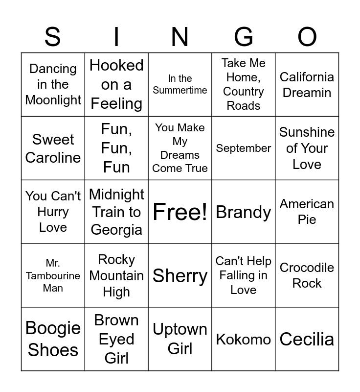 This bingo card has a free space and 29 words: Boogie Shoes, Build Me Up Buttercup, Midnight Train to Georgia, King of the Road, Dancing in the Moonlight, In the Summertime, Fun, Fun, Fun, Rocky Mountain High, Brandy, Brown Eyed Girl, American Pie, Cecilia, Uptown Girl, Kokomo, Sunshine of Your Love, Under the Boardwalk, Sherry, Mr. Tambourine Man, California Dreamin, You Can't Hurry Love, Can't Help Falling in Love, This Will Be, September, Sweet Caroline, Take Me Home, Country Roads, Hooked on a Feeling, Crocodile Rock, You Make My Dreams Come True and Wouldn't It Be Nice.