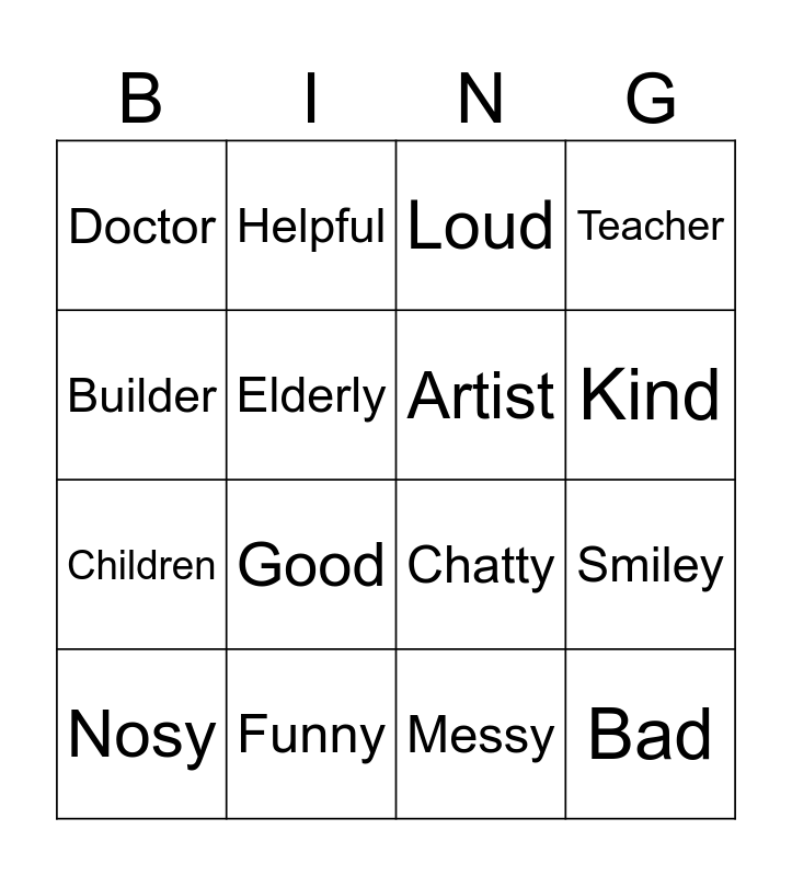 This bingo card has 18 words: Good, Bad, Loud, Doctor, Chatty, Teacher, Nosy, Helpful, Kind, Children, Messy, Builder, Smiley, Elderly, Artist, Singer, Funny and Respectful.