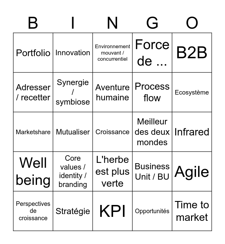 This bingo card has 44 words: Win-win, Croissance, Key player, Perspectives de croissance, Fusion, Opportunités, Environnement mouvant / concurrentiel, IA, B2B, Stratégie, Force de ..., Meilleur des deux mondes, L'herbe est plus verte, Core values / identity / branding, Industrie 4.0 >, KPI, Customer satisfaction, Marketshare, Partenariat, Ecosystème, Innovation, Ensemble, Pérennité, Portfolio, Digital / digitalisation, Infrared, Compétitivité, Vivier / talent / force vive, Business Unit / BU, Well being, Team building, Agile, Leadership, Souverain, Mutualiser, Indépendant, Sociétal / environnemental, Time to market, Aventure humaine, Adresser / recetter, Process flow, Supply chain, Synergie / symbiose and Swap / swapc.