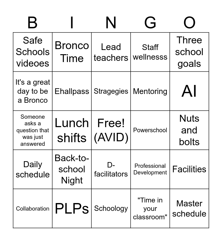 This bingo card has a free space and 39 words: Convocation, Staff shirts, Bronco Time, Ehallpass, Collaboration, D-facilitators, Stragegies, Sense of community, Three school goals, Daily schedule, Lunch shifts, Staff wellnesss, Master schedule, Nuts and bolts, Powerschool, Back-to-school Night, Dyslexia Training, Safe Schools videoes, New staff, Professional Development, It's a great day to be a Bronco, Schoology, Mentoring, AI, SBEs, Panorama, Post-secondary success, Bond, academic achievement, Bronco Time, Freshmen Transition Day, Convocation, Lead teachers, PLPs, "Time in your classroom", Essential Memo, Facilities, Someone asks a question that was just answered and Someone asks a legit question.