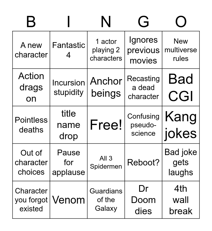 This bingo card has a free space and 24 words: Pause for applause, Venom, Anchor beings, Character you forgot existed, New multiverse rules, A new character, Action drags on, Fantastic 4, Confusing pseudo-science, All 3 Spidermen, Recasting a dead character, Pointless deaths, Reboot?, Bad joke gets laughs, Incursion stupidity, Dr Doom dies, Kang jokes, 1 actor playing 2 characters, Bad CGI, title name drop, 4th wall break, Out of character choices, Ignores previous movies and Guardians of the Galaxy.
