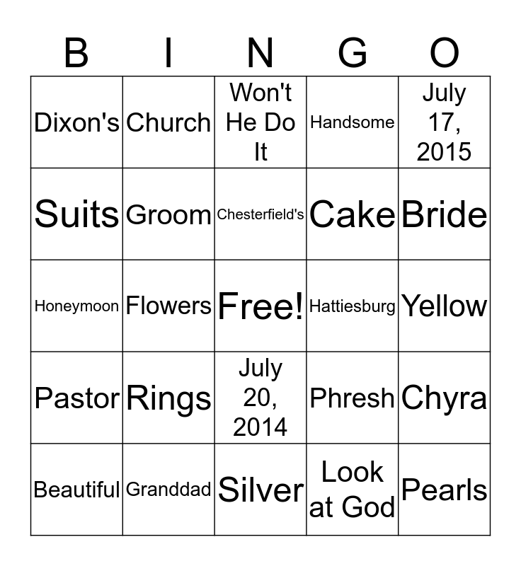 This bingo card has a free space and 24 words: Rings, Granddad, Chesterfield's, Beautiful, July 17, 2015, Dixon's, Suits, Church, Hattiesburg, July 20, 2014, Cake, Honeymoon, Phresh, Chyra, Groom, Look at God, Yellow, Won't He Do It, Bride, Flowers, Pearls, Pastor, Handsome and Silver.