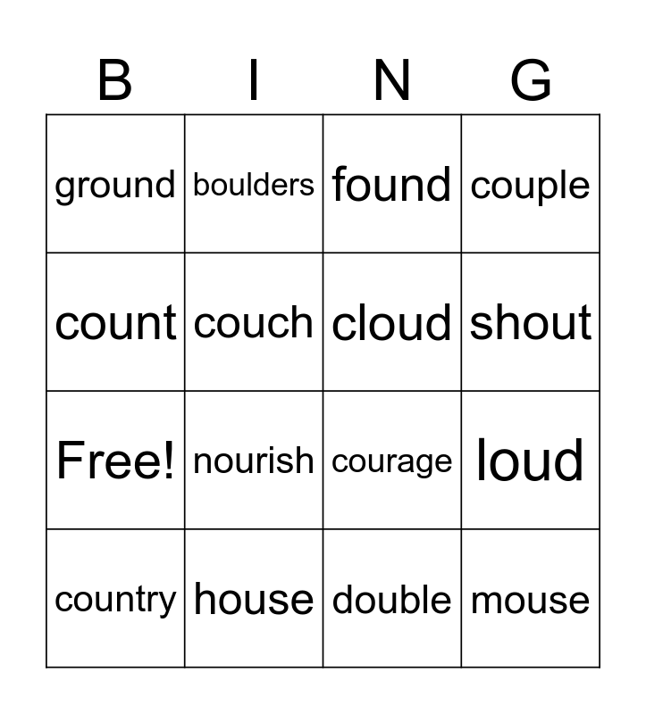 This bingo card has 20 words: loud, out, found, couple, country, count, house, ground, Free!, boulders, nourish, courage, couch, mouse, cloud, mouth, shout, couple, double and around.