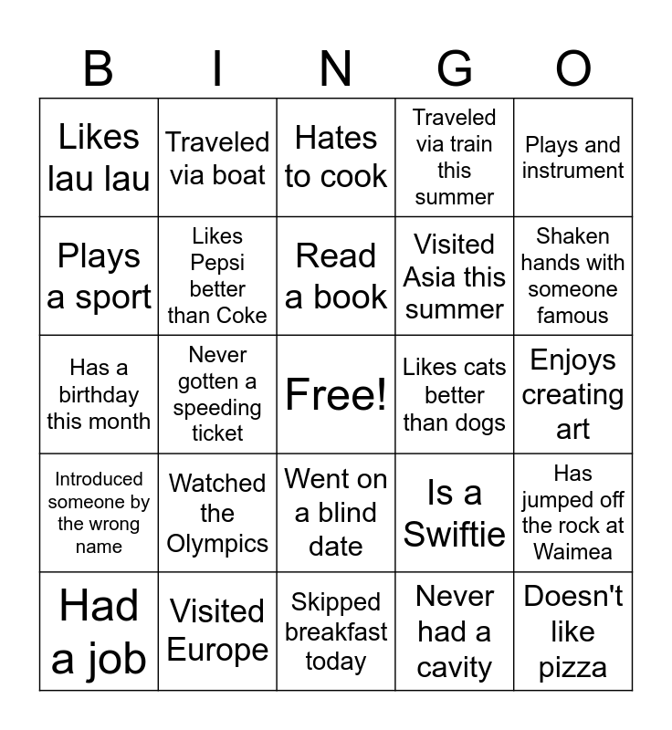 This bingo card has a free space and 24 words: Watched the Olympics, Visited Europe, Read a book, Had a job, Plays and instrument, Likes lau lau, Plays a sport, Traveled via boat, Likes cats better than dogs, Went on a blind date, Visited Asia this summer, Has a birthday this month, Is a Swiftie, Has jumped off the rock at Waimea, Likes Pepsi better than Coke, Never had a cavity, Enjoys creating art, Hates to cook, Shaken hands with someone famous, Never gotten a speeding ticket, Doesn't like pizza, Introduced someone by the wrong name, Traveled via train this summer and Skipped breakfast today.