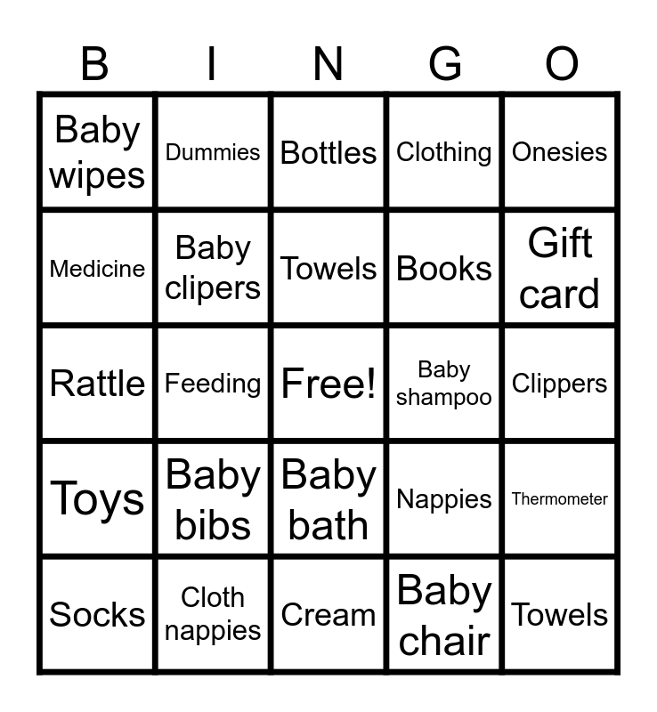 This bingo card has a free space and 24 words: Baby bibs, Cloth nappies, Towels, Socks, Onesies, Baby wipes, Medicine, Dummies, Baby shampoo, Baby bath, Books, Rattle, Nappies, Thermometer, Baby clipers, Baby chair, Clippers, Bottles, Gift card, Feeding, Towels, Toys, Clothing and Cream.