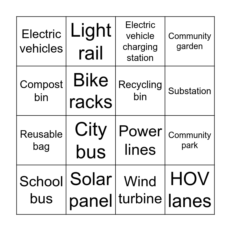 This bingo card has 22 words: Solar panel, Transit bus, Light rail, Biker, Bike racks, Recycling bin, Electric vehicles, Electric vehicle charging station, Power lines, HOV lanes, Reusable bag, Community garden, Home garden, School garden, Wind turbine, Hybrid vehicle, Community park, School bus, City bus, Compost bin, Substation and Sunflowers.