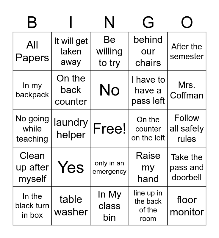This bingo card has a free space and 25 words: Yes, In My class bin, No, In the black turn in box, After the semester, All Papers, In my backpack, It will get taken away, On the counter on the left, only in an emergency, I have to have a pass left, No going while teaching, Raise my hand, Take the pass and doorbell, On the back counter, Treat others well, Follow all safety rules, Be willing to try, Mrs. Coffman, laundry helper, floor monitor, table washer, Clean up after myself, behind our chairs and line up in the back of the room.