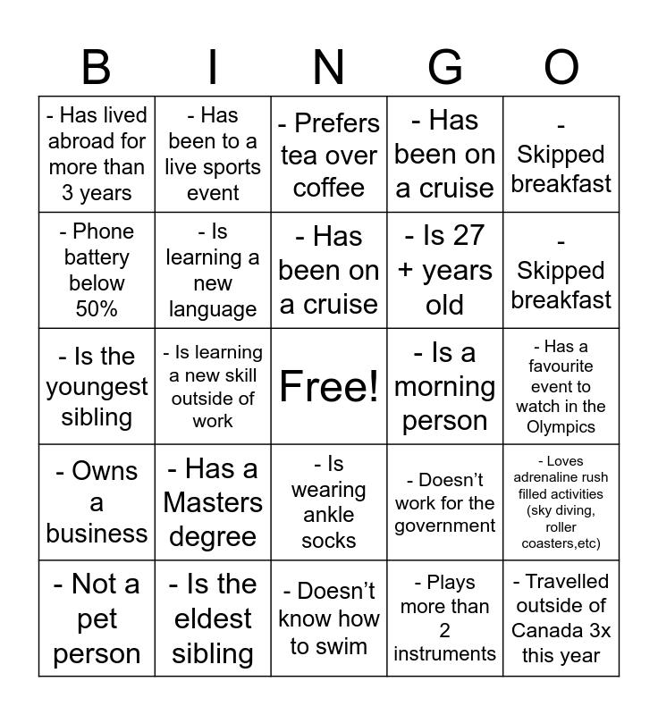 This bingo card has a free space and 28 words: - Loves adrenaline rush filled activities (sky diving, roller coasters,etc), - Can quote a line from a movie, - Is 27 + years old, - Plays more than 2 instruments, - Phone battery below 50%, - Prefers tea over coffee, - Has been to a live sports event, - Owns a business, - Is a morning person, - Not a pet person, - Is the youngest sibling, - Has been on a cruise, - Is the eldest sibling, - Doesn’t know how to swim, - Skipped breakfast, - Read a fictional book this year, - Has a Masters degree, - Is learning a new language, - Has been on a cruise, - Is wearing ankle socks, - Has lived abroad for more than 3 years, - Has gone to see a movie in theatres this year, - Travelled outside of Canada 3x this year, - Is learning a new skill outside of work, - Has a favourite event to watch in the Olympics, - Doesn’t work for the government, - Skipped breakfast and - Has a favourite local restaurant.