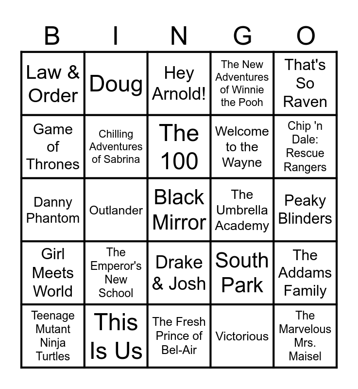 This bingo card has 102 words: Free!, Hannah Montana, That's So Raven, Lizzie McGuire, Kim Possible, Phineas and Ferb, The Suite Life of Zack & Cody, Wizards of Waverly Place, Good Luck Charlie, Jessie, The Proud Family, Even Stevens, Austin & Ally, Liv and Maddie, Dog with a Blog, Shake It Up, Girl Meets World, K.C. Undercover, Elena of Avalor, Gravity Falls, DuckTales, Big City Greens, The Owl House, Star vs. The Forces of Evil, Mickey Mouse Clubhouse, Chip 'n Dale: Rescue Rangers, The New Adventures of Winnie the Pooh, The Emperor's New School, Buzz Lightyear of Star Command, Rugrats, Doug, Hey Arnold!, SpongeBob SquarePants, The Fairly OddParents, Jimmy Neutron: Boy Genius, Drake & Josh, Zoey 101, Avatar: The Last Airbender, Danny Phantom, Victorious, iCarly, Big Time Rush, Teenage Mutant Ninja Turtles, Sanjay and Craig, Breadwinners, Harvey Beaks, The Loud House, Welcome to the Wayne, The Casagrandes, Danger Force, Kamp Koral: SpongeBob's Under Years, Stranger Things, Game of Thrones, Friends, Breaking Bad, The Office (US), The Mandalorian, The Witcher, Rick and Morty, Black Mirror, The Crown, Sherlock, Westworld, The Walking Dead, Riverdale, Grey's Anatomy, The Big Bang Theory, Peaky Blinders, Outlander, This Is Us, The Handmaid's Tale, Orange Is the New Black, The Marvelous Mrs. Maisel, Narcos, Daredevil, Mindhunter, Chilling Adventures of Sabrina, Doctor Who, Supernatural, Suits, Vikings, The Good Place, Cobra Kai, The Umbrella Academy, Brooklyn Nine-Nine, The 100, The Haunting of Hill House, Gossip Girl, 13 Reasons Why, The Simpsons, Family Guy, South Park, American Horror Story, The Flash, Arrow, The Fresh Prince of Bel-Air, Law & Order, The Walking Dead, The Addams Family, The Flintstones, Saved by the Bell and The Golden Girls.