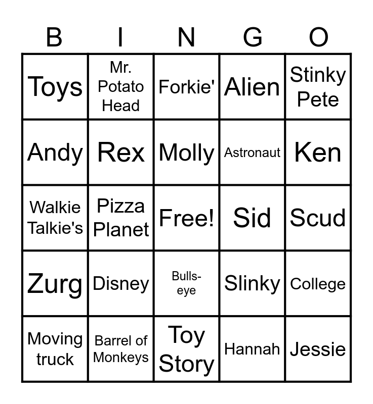 This bingo card has a free space and 49 words: Woody, Jessie, Buzz Lightyear, Toy Story, Disney, Pixar, Mr. Potato Head, Bo Peep, Andy, Mrs. Potato Head, Rex, Alien, College, Slinky, Army Men, Hamm, Molly, Sid, Cowboy Hat, Stinky Pete, Pizza Planet, Hannah, Toys, Astronaut, Barbie, Ken, Moving truck, Andy's Bedroom, Bulls-eye, Zurg, Friends, Cowboy Boots, Lotso, "You've Got a Friend in Me....", Barrel of Monkeys, RC Car, Etch-a-sketch, Mr. Spell, Scud, Lenny, Sheriff, Rummage Sale, Troll, Chucky Doll, Walkie Talkie's, Forkie', Tom Hanks, Tim Allen and To Infinity and Beyond.