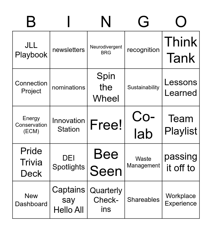 This bingo card has a free space and 24 words: DEI Spotlights, Captains say Hello All, Spin the Wheel, New Dashboard, Think Tank, JLL Playbook, Connection Project, newsletters, Co-lab, Bee Seen, Sustainability, Energy Conservation (ECM), Waste Management, passing it off to, nominations, Shareables, Team Playlist, Neurodivergent BRG, Lessons Learned, Innovation Station, Workplace Experience, Pride Trivia Deck, recognition and Quarterly Check-ins.