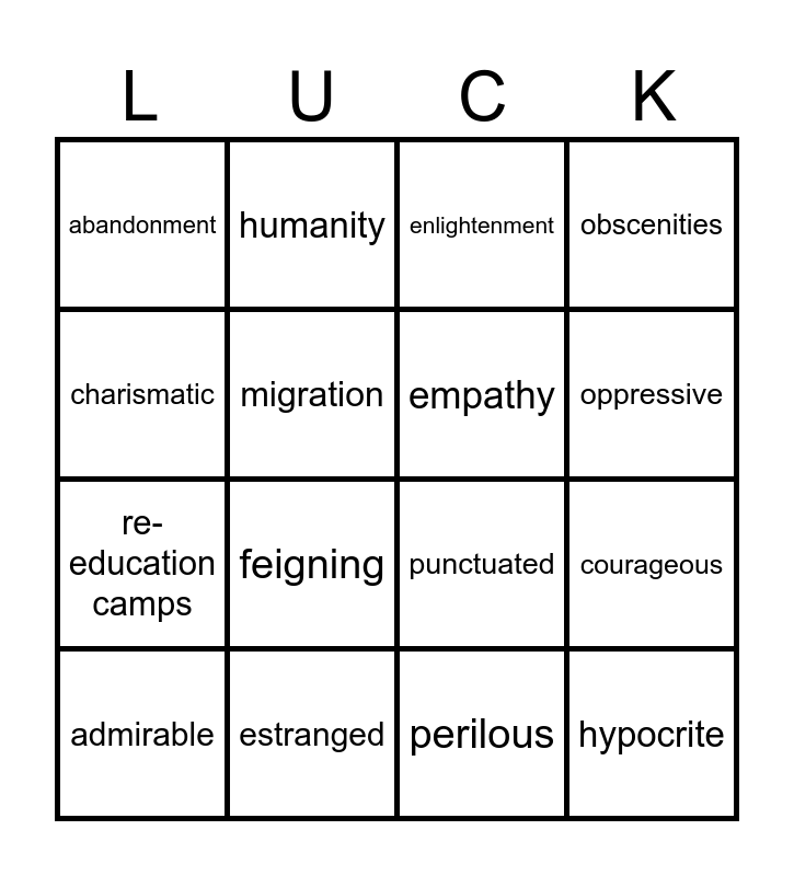 This bingo card has 28 words: refugee, wantonly, re-education camps, gesticulated, migration, enlightenment, humanity, hypocrite, estranged, ingenuity, punctuated, obscenities, hoisted, communist, feigning, poverty, indulged, empathy, oppressive, opponents, abandonment, industriousness, admirable, courageous, perilous, meagre, charismatic and deprivation.