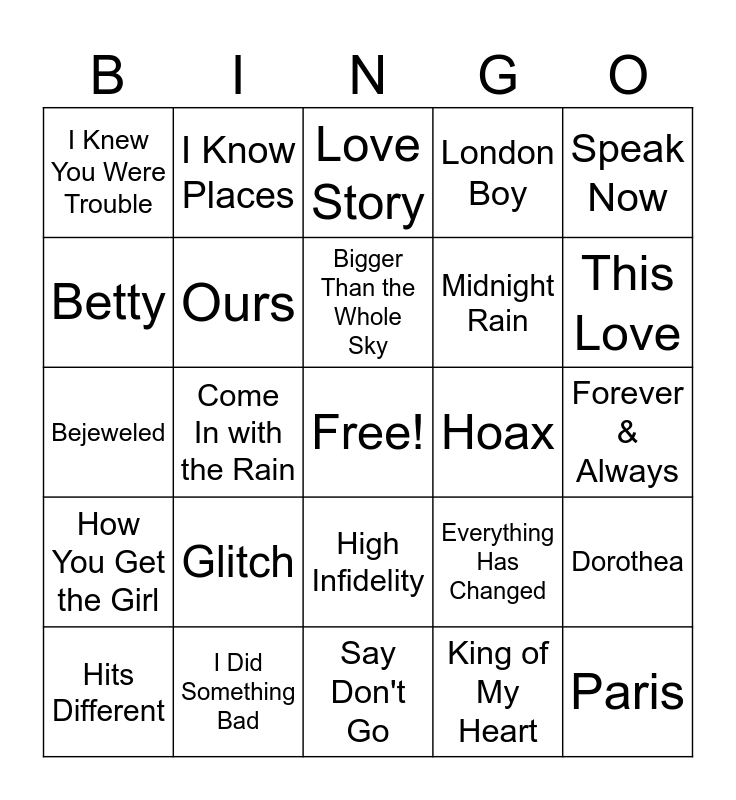This bingo card has a free space and 157 words: The 1, 22, Afterglow, All of the Girls You Loved Before, All Too Well, All You Had to Do Was Stay, Anti-Hero, The Archer, August, Back to December, Bad Blood, Begin Again, Bejeweled, Better than Revenge, Betty, Bigger Than the Whole Sky, Blank Space, Breathe, Call It What You Want, Cardigan, Castles Crumbling, Champagne Problems, Change, Clean, Closure, Come Back... Be Here, Come In with the Rain, Coney Island, Cornelia Street, Cowboy Like Me, Cruel Summer, Dancing with Our Hands Tied, Daylight, Dear John, Dear Reader, Death by a Thousand Cuts, Delicate, Don't Blame Me, Dorothea, Dress, Electric Touch, Enchanted, End Game, Epiphany, Evermore, Everything Has Changed, Exile, Eyes Open, False God, Fearless, Fifteen, Forever & Always, Forever Winter, Getaway Car, Girl at Home, Glitch, Gold Rush, Gorgeous, The Great War, Happiness, Haunted, High Infidelity, Hits Different, Hoax, Holy Ground, How You Get the Girl, I Almost Do, I Bet You Think About Me, I Can See You, I Did Something Bad, I Don't Wanna Live Forever, I Forgot That You Existed, I Knew You Were Trouble, I Know Places, I Think He Knows, I Wish You Would, If This Was a Movie, Illicit Affairs, Innocent, Invisible String, Is It Over Now?, It's Nice to Have a Friend, It's Time to Go, Ivy, Jump Then Fall, Karma, King of My Heart, Labyrinth, The Lakes, The Last Great American Dynasty, Last Kiss, Lavender Haze, London Boy, Long Live, Long Story Short, Look What You Made Me Do, Love Story, Lover, The Lucky One, Mad Woman, The Man, Marjorie, Maroon, Mastermind, Me!, Mean, Message in a Bottle, Midnight Rain, Mine, Mirrorball, Miss Americana & the Heartbreak Prince, Mr. Perfectly Fine, The Moment I Knew, My Tears Ricochet, Never Grow Up, New Romantics, New Year's Day, No Body, No Crime, Nothing New, Now That We Don't Talk, The Other Side of the Door, Ours, Out of the Woods, Paper Rings, Paris, Peace, Question...?, ...Ready for It?, Red, Right Where You Left Me, Ronan, Run, Sad Beautiful Tragic, Safe & Sound, Say Don't Go, Seven, Shake It Off, "Slvt!", Snow on the Beach, So It Goes..., Soon You'll Get Better, Sparks Fly, Speak Now, Starlight, State of Grace, Stay Stay Stay, The Story of Us, Style, Superman, Superstar, Sweet Nothing, Sweeter than Fiction, That's When, This Is Me Trying, This Is Why We Can't Have Nice Things, This Love and Vigilante Shhh.