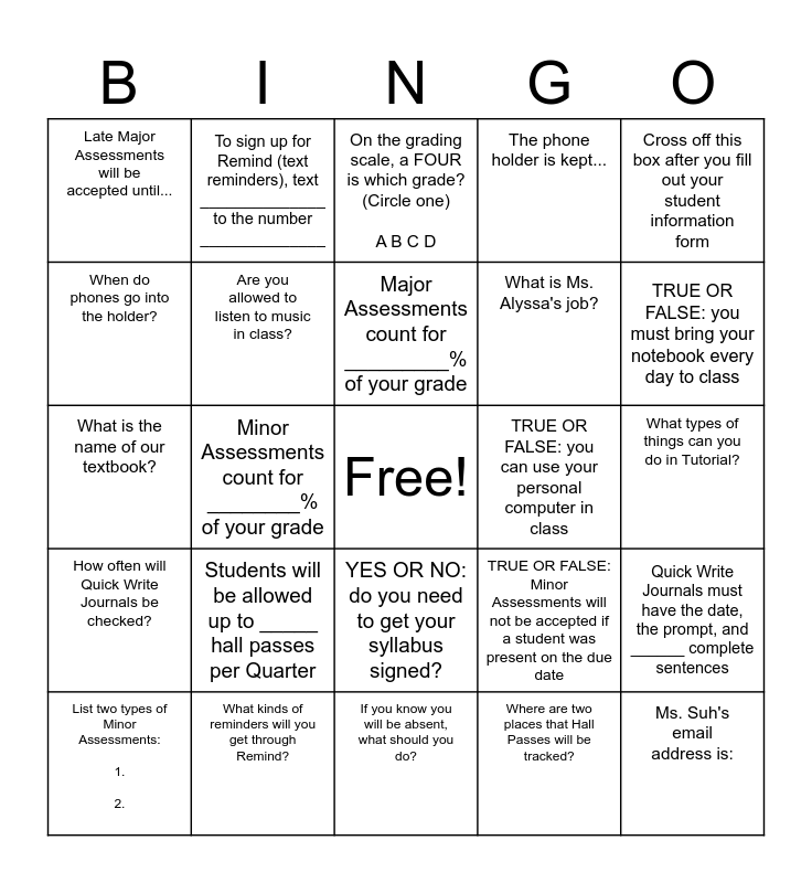 This bingo card has a free space and 27 words: TRUE OR FALSE: Minor Assessments will not be accepted if a student was present on the due date, List two types of Major Assessments: 1. 2., What is Ms. Alyssa's job?, If you know you will be absent, what should you do?, When do phones go into the holder?, On the grading scale, a FOUR is which grade? (Circle one) A B C D, To sign up for Remind (text reminders), text ______________ to the number ______________, How often will Quick Write Journals be checked?, TRUE OR FALSE: you can use your personal computer in class, Quick Write Journals must have the date, the prompt, and ______ complete sentences, What is the name of our textbook?, The phone holder is kept..., List two types of Minor Assessments: 1. 2., What kinds of reminders will you get through Remind?, TRUE OR FALSE: you must bring your notebook every day to class, TRUE OR FALSE: you can revise your Major Assessments, Are you allowed to listen to music in class?, Major Assessments count for _________% of your grade, Students will be allowed up to _____ hall passes per Quarter, Late Major Assessments will be accepted until..., What types of things can you do in Tutorial?, Where are two places that Hall Passes will be tracked?, Minor Assessments count for ________% of your grade, Ms. Suh's email address is:, YES OR NO: do you need to get your syllabus signed?, Cross off this box after you fill out your student information form and TRUE OR FALSE: There is extra credit in English 9.
