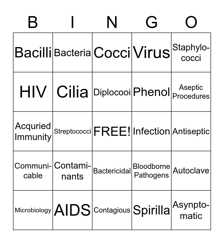 This bingo card has a free space and 24 words: Contami-nants, AIDS, Diplocooi, Microbiology, Staphylo-cocci, Bacilli, HIV, Bacteria, Infection, Bactericidal, Phenol, Acquried Immunity, Bloodborne Pathogens, Autoclave, Cilia, Spirilla, Antiseptic, Cocci, Aseptic Procedures, Streptococci, Asynpto-matic, Communi-cable, Virus and Contagious.