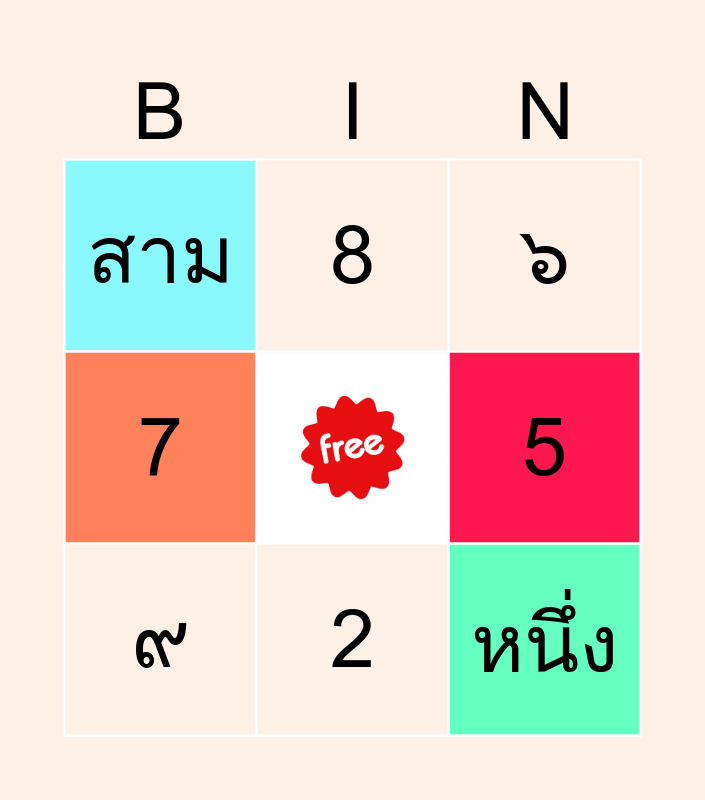 This bingo card has a free space and 17 words: 9, two, 5, สาม, 6, 7, 4, หนึ่ง, ๙, 2, ห้า, 3, 8, ๖, ๗, สี่ and one.