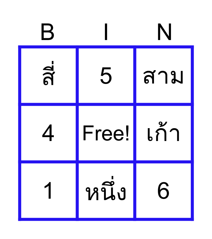 This bingo card has a free space and 14 words: 3, 2, 1, 5, 4, 6, 7, 8, หนึ่ง, สี่, 2, เก้า, สาม and five.