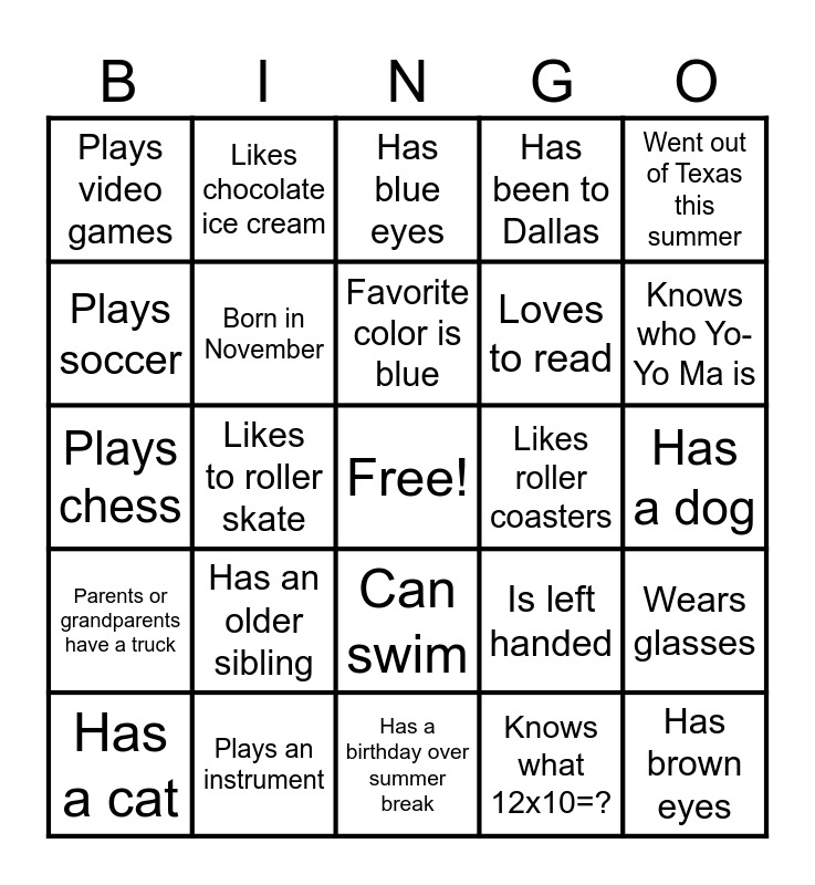 This bingo card has a free space and 24 words: Has an older sibling, Plays an instrument, Favorite color is blue, Has a cat, Went out of Texas this summer, Plays video games, Plays soccer, Likes chocolate ice cream, Likes roller coasters, Can swim, Loves to read, Plays chess, Is left handed, Wears glasses, Born in November, Knows what 12x10=?, Has a dog, Has blue eyes, Knows who Yo-Yo Ma is, Likes to roller skate, Has brown eyes, Parents or grandparents have a truck, Has been to Dallas and Has a birthday over summer break.