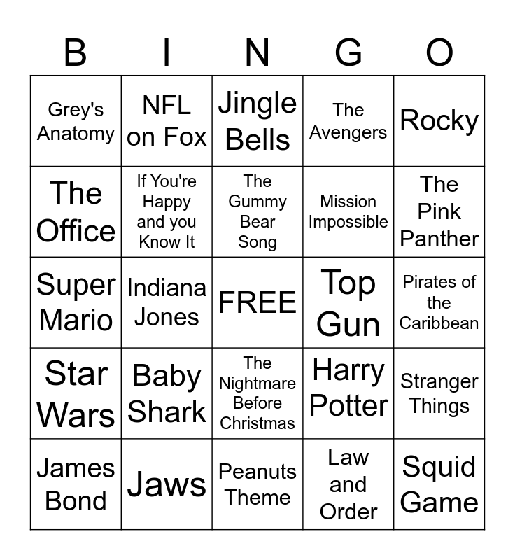 This bingo card has a free space and 27 words: Harry Potter, The Lion King, Mission Impossible, Peanuts Theme, The Office, Jingle Bells, NFL on Fox, Star Wars, Top Gun, Stranger Things, Super Mario, The Avengers, James Bond, Jaws, The Pink Panther, Jaws, If You're Happy and you Know It, The Gummy Bear Song, Baby Shark, Grey's Anatomy, Pirates of the Caribbean, Law and Order, Indiana Jones, Squid Game, The Nightmare Before Christmas, Rocky and James Bond.