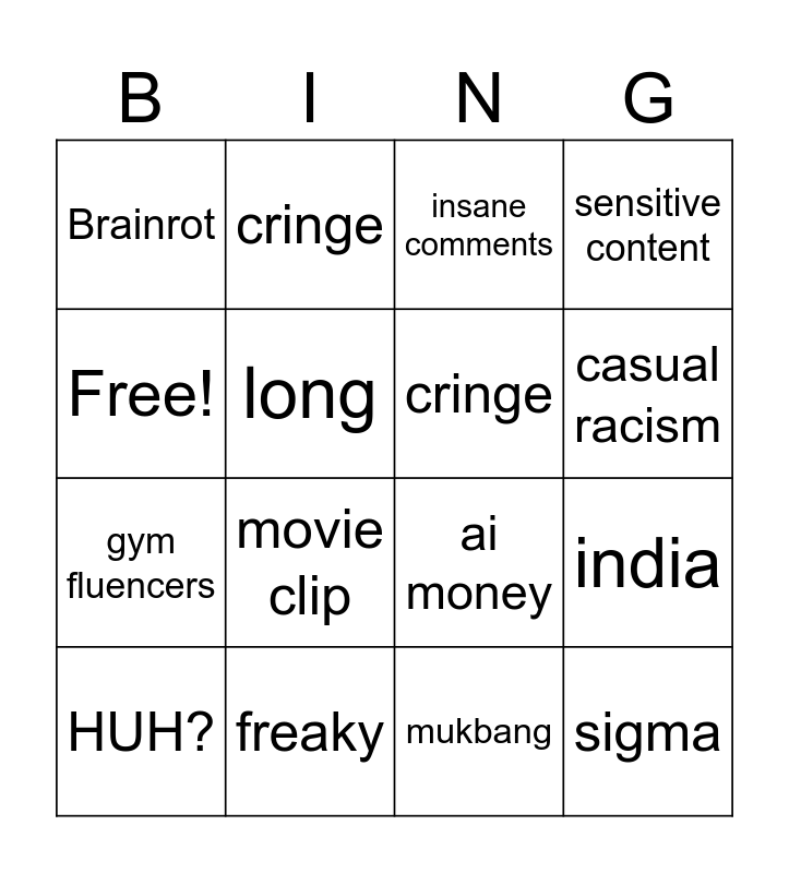 This bingo card has 16 words: freaky, india, insane comments, Brainrot, gym fluencers, cringe, ai money, mukbang, Free!, long, HUH?, sensitive content, movie clip, casual racism, cringe and sigma.