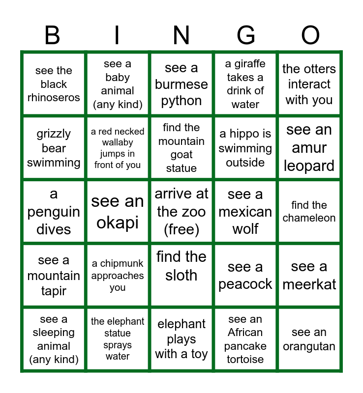 This bingo card has a free space and 24 words: a chipmunk approaches you, the elephant statue sprays water, find the mountain goat statue, see a sleeping animal (any kind), the otters interact with you, see the black rhinoseros, grizzly bear swimming, see a baby animal (any kind), see a mexican wolf, find the sloth, a hippo is swimming outside, a penguin dives, see a peacock, see a meerkat, a red necked wallaby jumps in front of you, see an African pancake tortoise, find the chameleon, see a burmese python, see an amur leopard, see an okapi, see an orangutan, see a mountain tapir, a giraffe takes a drink of water and elephant plays with a toy.