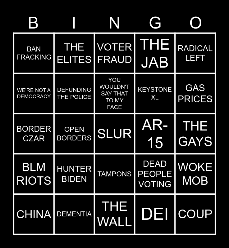This bingo card has a free space and 24 words: HUNTER BIDEN, DEMENTIA, YOU WOULDN'T SAY THAT TO MY FACE, CHINA, RADICAL LEFT, BAN FRACKING, WE'RE NOT A DEMOCRACY, THE ELITES, AR-15, TAMPONS, KEYSTONE XL, BORDER CZAR, DEAD PEOPLE VOTING, WOKE MOB, DEFUNDING THE POLICE, DEI, THE GAYS, VOTER FRAUD, GAS PRICES, OPEN BORDERS, COUP, BLM RIOTS, THE JAB and THE WALL.