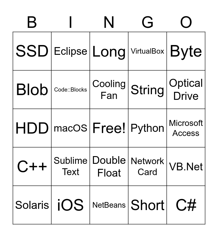 This bingo card has a free space and 50 words: Java, C#, Boolean, NetBeans, Sublime Text, Long Blob, Eclipse, Visual Studio, Blob, Semicolon, Code::Blocks, VirtualBox, VB.Net, Network Card, Float, RAM, Cooling Fan, Python, Notepad++, Byte, macOS, Short, SSD, String, JavaScript, Linux, Optical Drive, Windows, Long, Double Float, CPU, Excel, Ubuntu, Power Supply Unit, iOS, Visual Studio Code, Dart, PHP, Char, Microsoft Access, GPU, Flutter, Motherboard, Integer, Solaris, HDD, Android, ROM, C++ and Xampp.