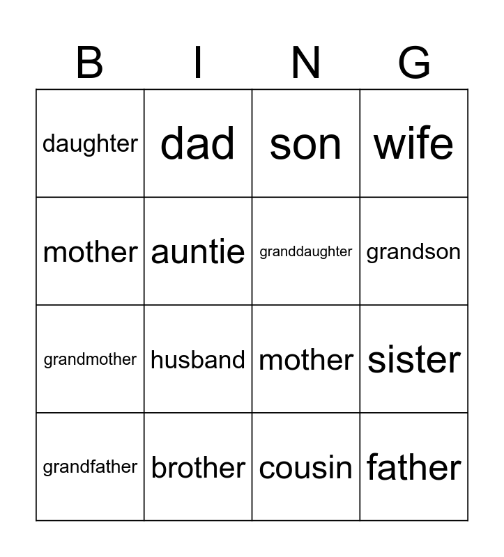 This bingo card has 16 words: brother, sister, son, daughter, grandmother, dad, mother, cousin, mother, auntie, grandfather, wife, husband, grandson, granddaughter and father.