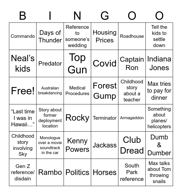 This bingo card has 36 words: Jackass, Kenny Powers, Horses, Neal’s kids, “Last time I was in Hawaii…”, Forest Gump, Predator, Politics, Roadhouse, Club Dread, Indiana Jones, Housing Prices, Dumb & Dumber, Australian breakdancing, Covid, Commando, Childhood story involving Sky, Childhood story about a teacher, Free!, Reference to someone’s wedding, Medical Procedures, Story about former deployment location, Terminator, Rocky, Armageddon, Days of Thunder, Captain Ron, Rambo, Top Gun, Tell the kids to settle down, Max talks about Tom throwing snails, Gen Z reference/ disdain, Something about planes/ helicopters, Max tries to pay for dinner, Monologue over a movie soundtrack in the car and South Park reference.