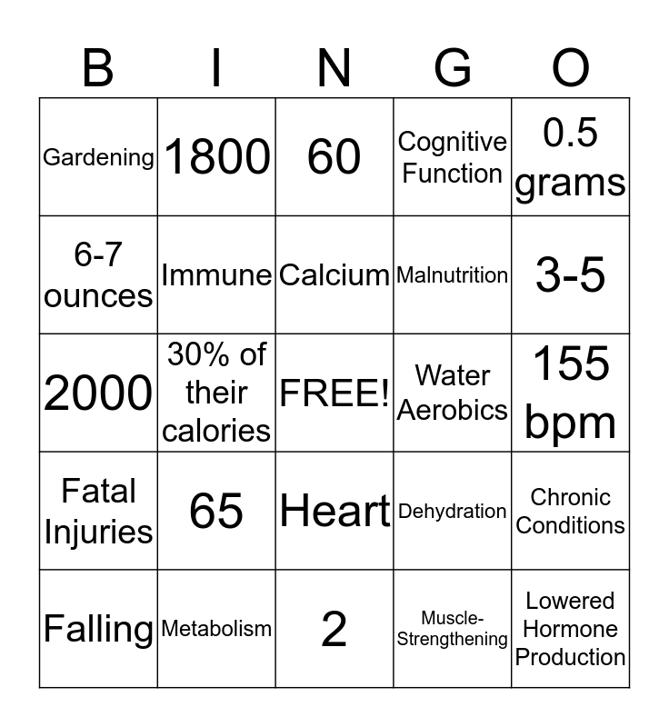 This bingo card has a free space and 24 words: 65, Metabolism, Calcium, Falling, 0.5 grams, Gardening, 6-7 ounces, 1800, Water Aerobics, Heart, Malnutrition, 2000, Dehydration, Chronic Conditions, Immune, Muscle-Strengthening, 155 bpm, 60, 3-5, 30% of their calories, Lowered Hormone Production, Fatal Injuries, Cognitive Function and 2.
