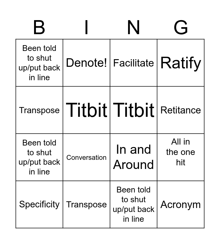 ⚠ This card has duplicate items: Transpose (2), Been told to shut up/put back in line (3), Titbit (2), Ratify (2)