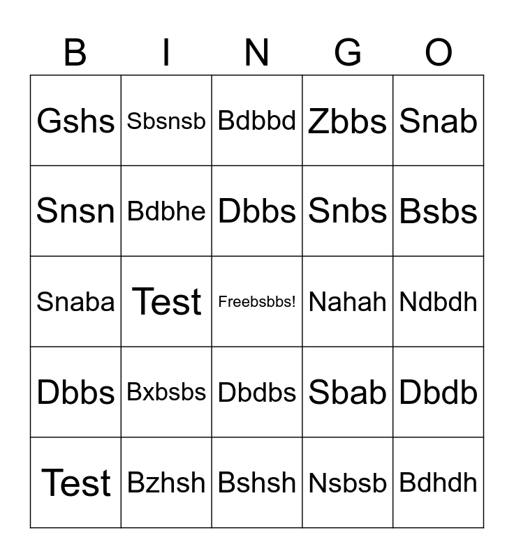 This bingo card has a free space and 29 words: Test, Test, Test, Tst, Gshs, Bdbbd, Bdbhe, Bxbsbs, Nahah, Bzhsh, Ndbdh, Bdhdh, Bshsh, Nsbsb, Bsbs, Bsbsba, Dbdbs, Dbbs, Snab, Snaba, Sbab, Snan, Snbs, Snsn, Zbbs, Sbsnsb, Dbdb, Dbbs and Dnsn.