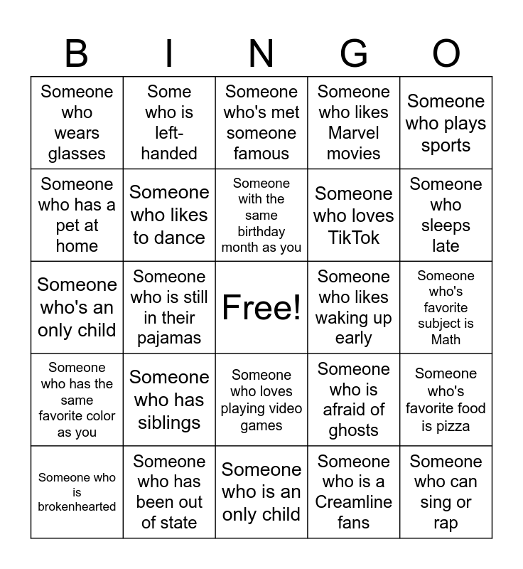 This bingo card has a free space and 24 words: Someone who has siblings, Someone who has been out of state, Someone with the same birthday month as you, Someone who is brokenhearted, Someone who plays sports, Someone who wears glasses, Someone who has a pet at home, Some who is left-handed, Someone who likes waking up early, Someone who loves playing video games, Someone who loves TikTok, Someone who's an only child, Someone who is afraid of ghosts, Someone who's favorite food is pizza, Someone who likes to dance, Someone who is a Creamline fans, Someone who's favorite subject is Math, Someone who's met someone famous, Someone who sleeps late, Someone who is still in their pajamas, Someone who can sing or rap, Someone who has the same favorite color as you, Someone who likes Marvel movies and Someone who is an only child.