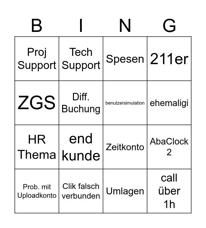 This bingo card has 16 words: Clik falsch verbunden, AbaClock 2, Spesen, Proj Support, HR Thema, Tech Support, Zeitkonto, Umlagen, ZGS, Diff. Buchung, Prob. mit Uploadkonto, 211er, end kunde, ehemaligi, benutzersimulation and call über 1h.