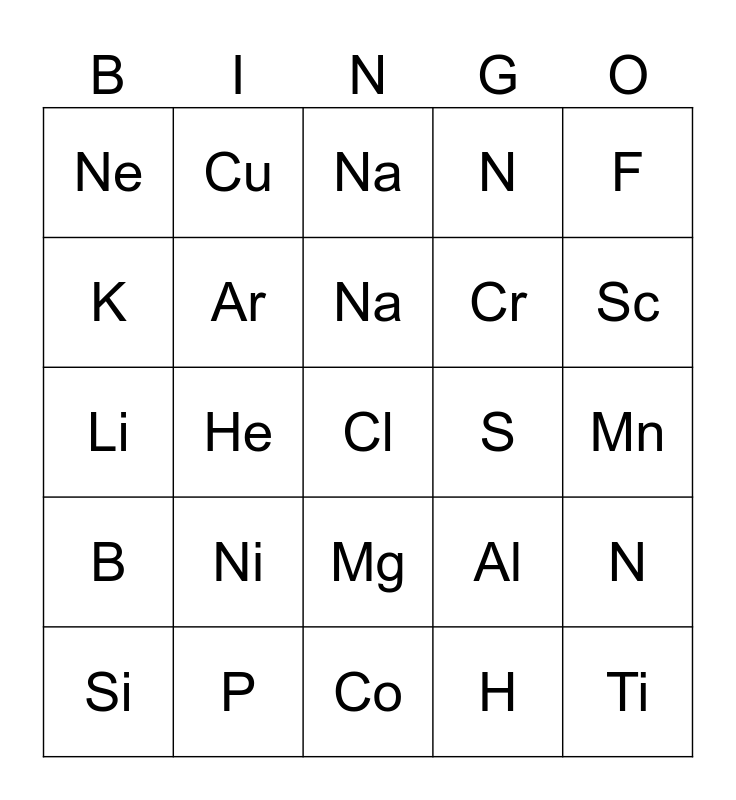 This bingo card has 35 words: Be, O, Ca, Ar, Mg, N, K, C, Na, F, Li, F, :), O, Ne, S, H, He, B, Cl, Al, Si, N, P, Na, Sc, Ti, V, Cr, Mn, Fe, Co, Ni, Cu and Zn.