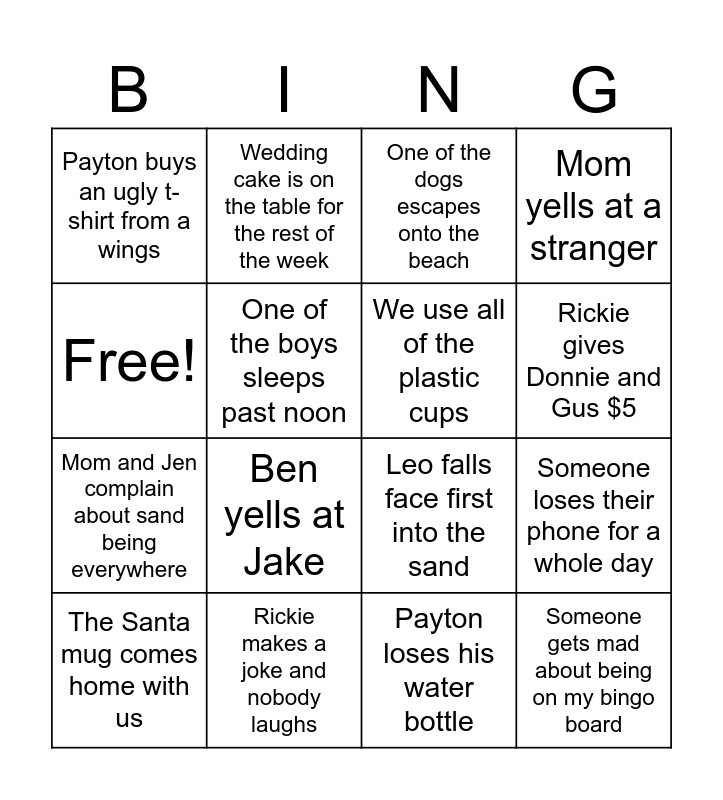 This bingo card has 16 words: Rickie makes a joke and nobody laughs, Someone loses their phone for a whole day, One of the dogs escapes onto the beach, Payton buys an ugly t-shirt from a wings, Mom and Jen complain about sand being everywhere, Wedding cake is on the table for the rest of the week, Leo falls face first into the sand, Payton loses his water bottle, Free!, One of the boys sleeps past noon, The Santa mug comes home with us, Mom yells at a stranger, Ben yells at Jake, Rickie gives Donnie and Gus $5, We use all of the plastic cups and Someone gets mad about being on my bingo board.