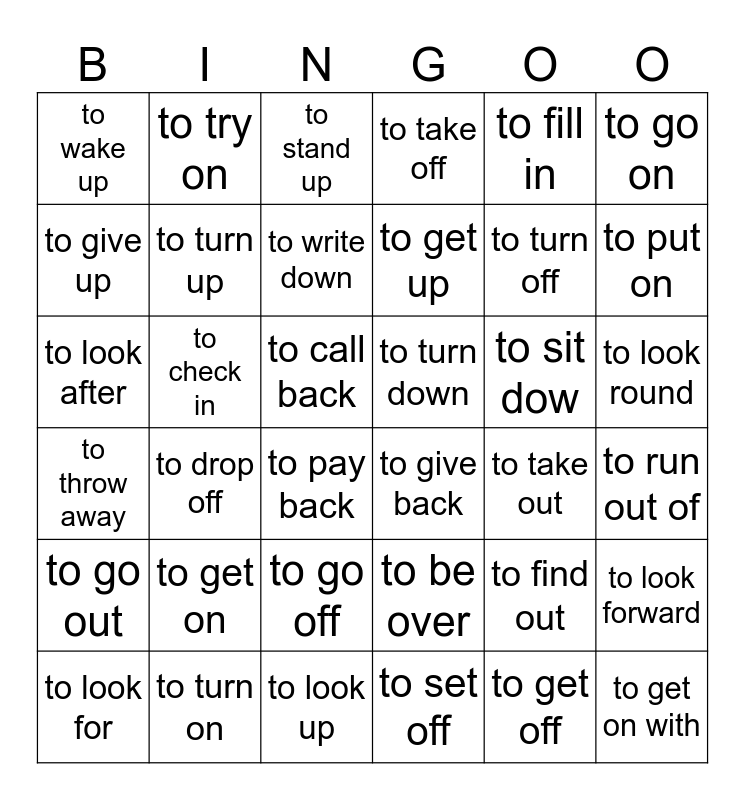 This bingo card has 36 words: to be over, to go off, to set off, to give up, to throw away, to turn down, to turn up, to look up, to fill in, to find out, to put on, to take off, to look forward, to check in, to get up, to wake up, to go out, to sit dow, to look after, to stand up, to call back, to drop off, to give back, to pay back, to take out, to try on, to turn off, to turn on, to write down, to go on, to get on with, to look for, to run out of, to look round, to get on and to get off.