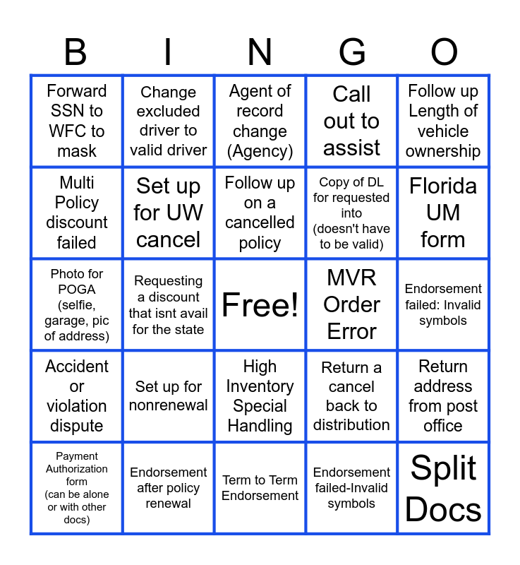 This bingo card has a free space and 24 words: Payment Authorization form (can be alone or with other docs), Set up for nonrenewal, Follow up on a cancelled policy, Endorsement failed-Invalid symbols, Follow up Length of vehicle ownership, Forward SSN to WFC to mask, Change excluded driver to valid driver, Agent of record change (Agency), MVR Order Error, Endorsement failed: Invalid symbols, Photo for POGA (selfie, garage, pic of address), Set up for UW cancel, Return a cancel back to distribution, Return address from post office, Multi Policy discount failed, Endorsement after policy renewal, Term to Term Endorsement, Call out to assist, Florida UM form, Accident or violation dispute, Requesting a discount that isnt avail for the state, High Inventory Special Handling, Copy of DL for requested into (doesn't have to be valid) and Split Docs.