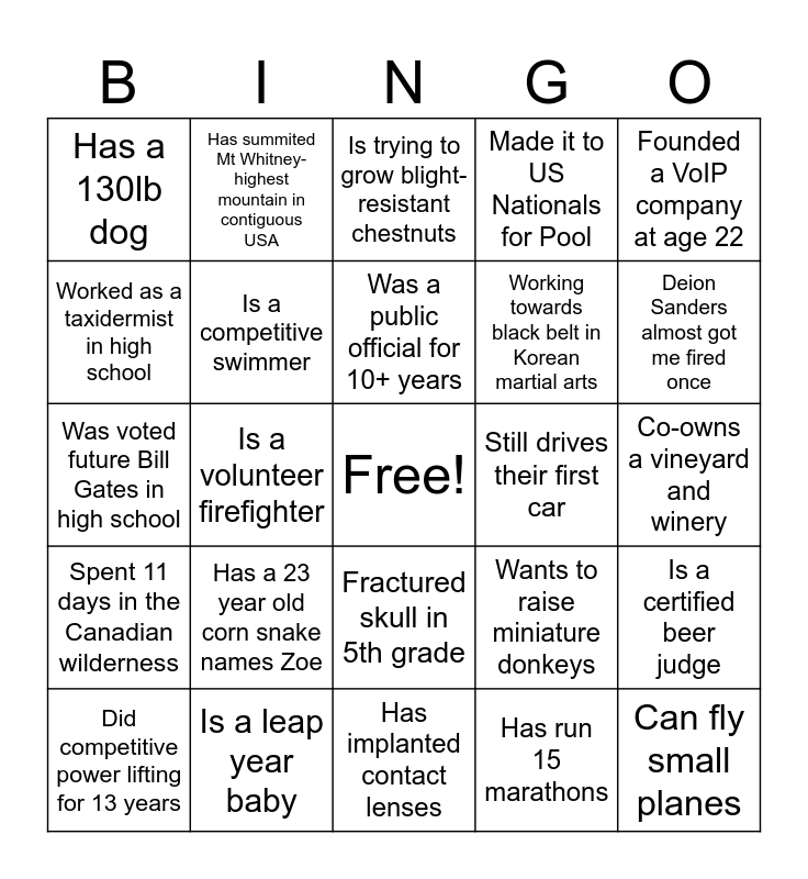 This bingo card has a free space and 24 words: Has a 23 year old corn snake names Zoe, Is a leap year baby, Was a public official for 10+ years, Did competitive power lifting for 13 years, Founded a VoIP company at age 22, Has a 130lb dog, Worked as a taxidermist in high school, Has summited Mt Whitney- highest mountain in contiguous USA, Still drives their first car, Fractured skull in 5th grade, Working towards black belt in Korean martial arts, Was voted future Bill Gates in high school, Wants to raise miniature donkeys, Is a certified beer judge, Is a competitive swimmer, Has run 15 marathons, Co-owns a vineyard and winery, Is trying to grow blight-resistant chestnuts, Deion Sanders almost got me fired once, Is a volunteer firefighter, Can fly small planes, Spent 11 days in the Canadian wilderness, Made it to US Nationals for Pool and Has implanted contact lenses.
